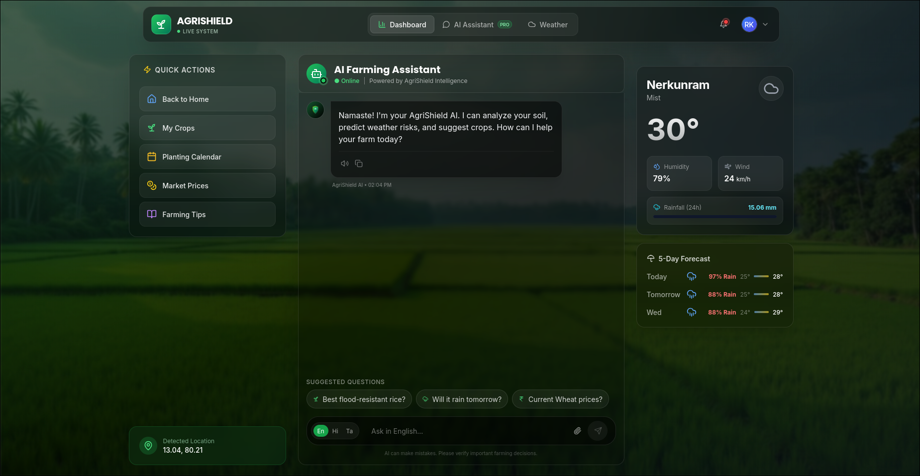 Smart agricultural platform empowering Indian farmers with AI-driven flood-resistant crop recommendations, real-time weather alerts, and 24/7 multilingual farming support. Combines modern web technologies with traditional farming wisdom to optimize planting schedules and reduce crop losses in flood-prone regions.